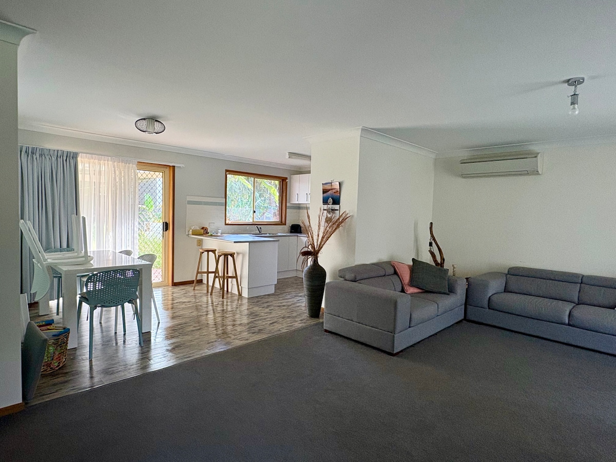 This stylish spacious terrace style townhouse has own private entrance consists of 2 bedrooms both with own bathrooms and main bedroom has balcony and walkin robe aircon internAl access from garage and tropical style paved courtyard with dining table and BBQ Short walk 5 minutes to Rocky and town beach one way or Flynns the opposite direction 3 minute walk to Coastal Walk Please keep in mind that it is a terrace with different levels so maybe not be suitable for toddlers