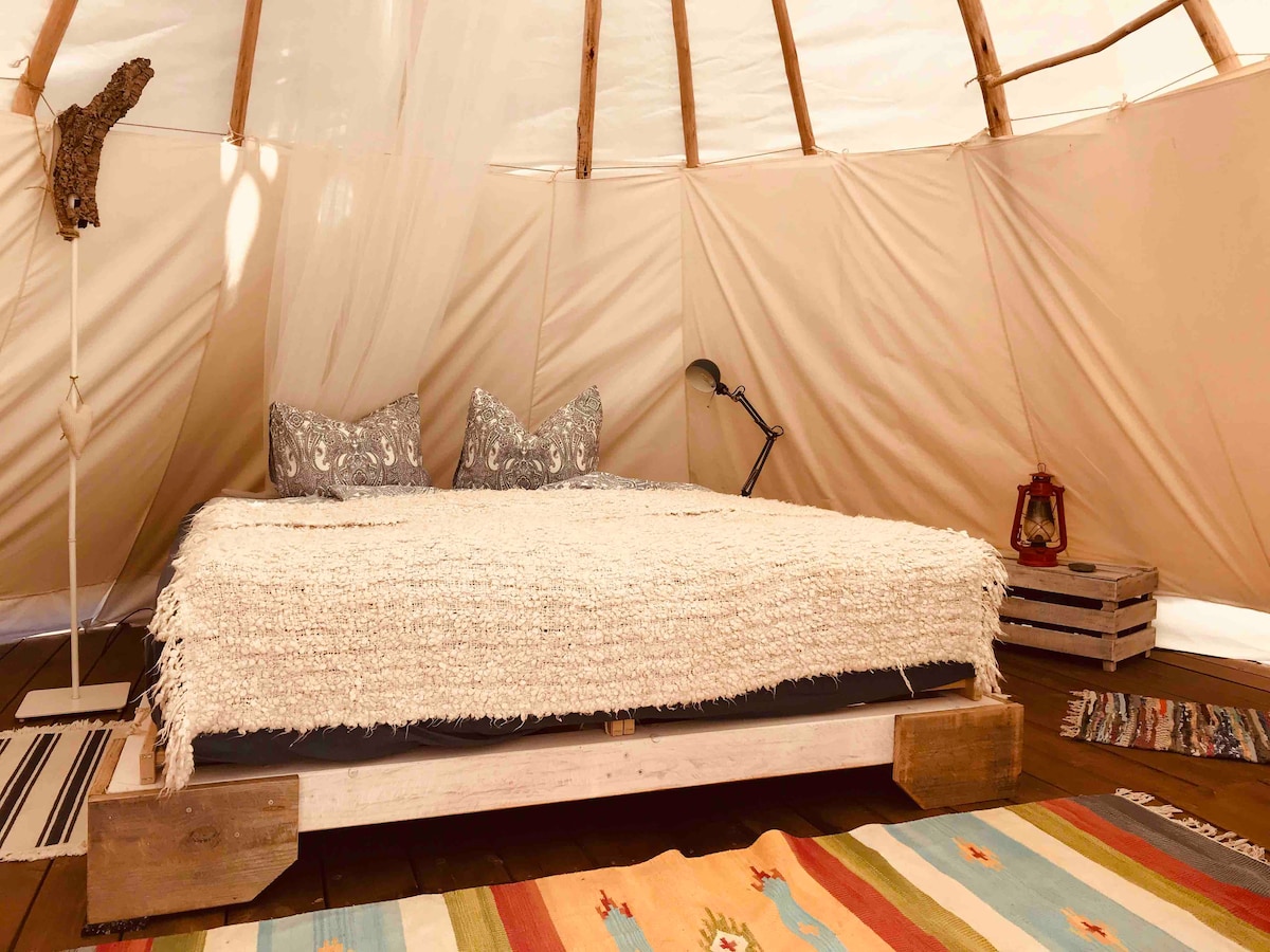 Unser wunderschönes Tipi, Durchm. 5 m, steht auf einem Holzdeck mit freiem Blick Richtung Sonnenuntergang. Das Bett mit der hochwertigen Matratze und die unglaublich gute Luft im Tipi lässt einen wunderbar schlafen..Ein antiker Schreibtisch, Kerzen und das Ambiente im Tipi schaffen einen romantische Atmosphäre . Die Naturtoilette und Aussendusche stehen in der Nähe. Wir verwenden Star-Link 💫 ☕️ Frühstück im Angebot, sep. buchbar siehe info ☕️ Breakfast (opt.,bookable sep.– see details