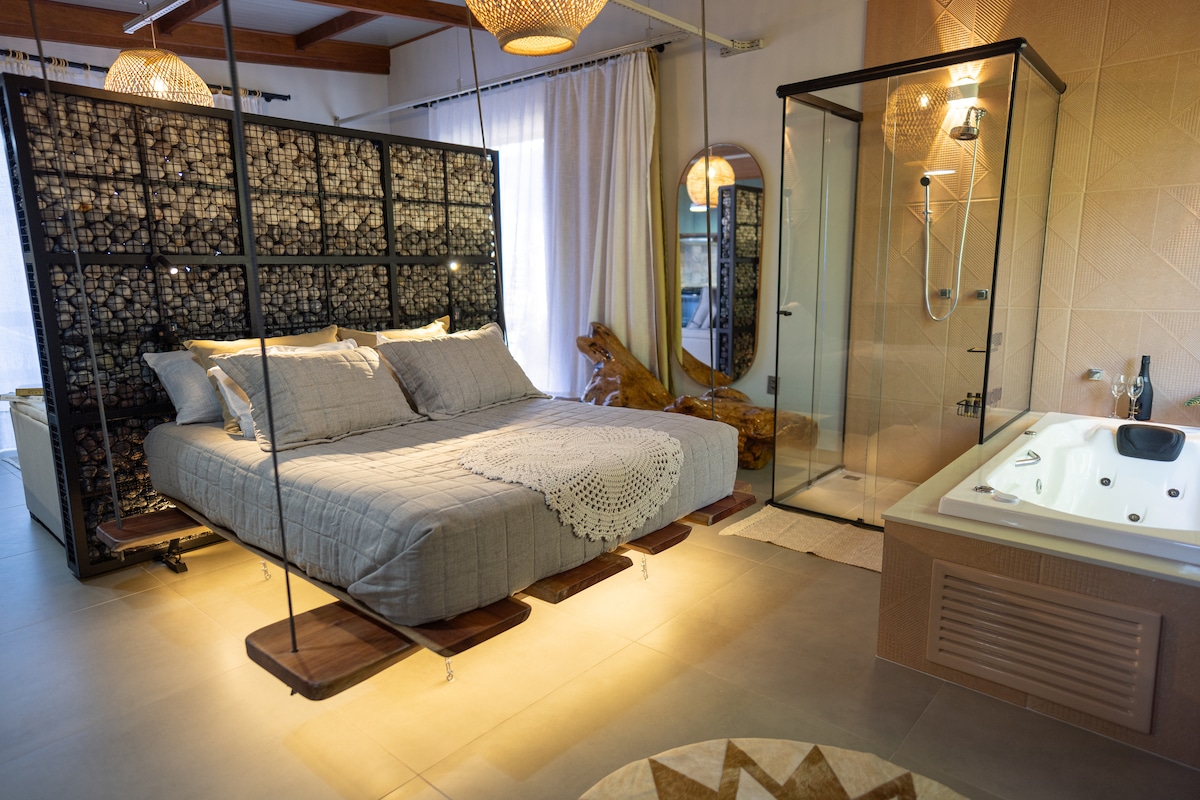 Luxurious and cozy space, remodeled in wood. Perfect internet for those who work from home. High-end Nipponflex bed with massage and heated Jacuzzi with hydro. For rainy or cold days, heater. The barbecue area overlooks the mountains and the Santinho sea. Located in the Santinho general area. Market and Buffet restaurant across the street. It is between 3 paradisiacal beaches with several trails. Come and experience this incredible magical spot on the best beach in Florianópolis.