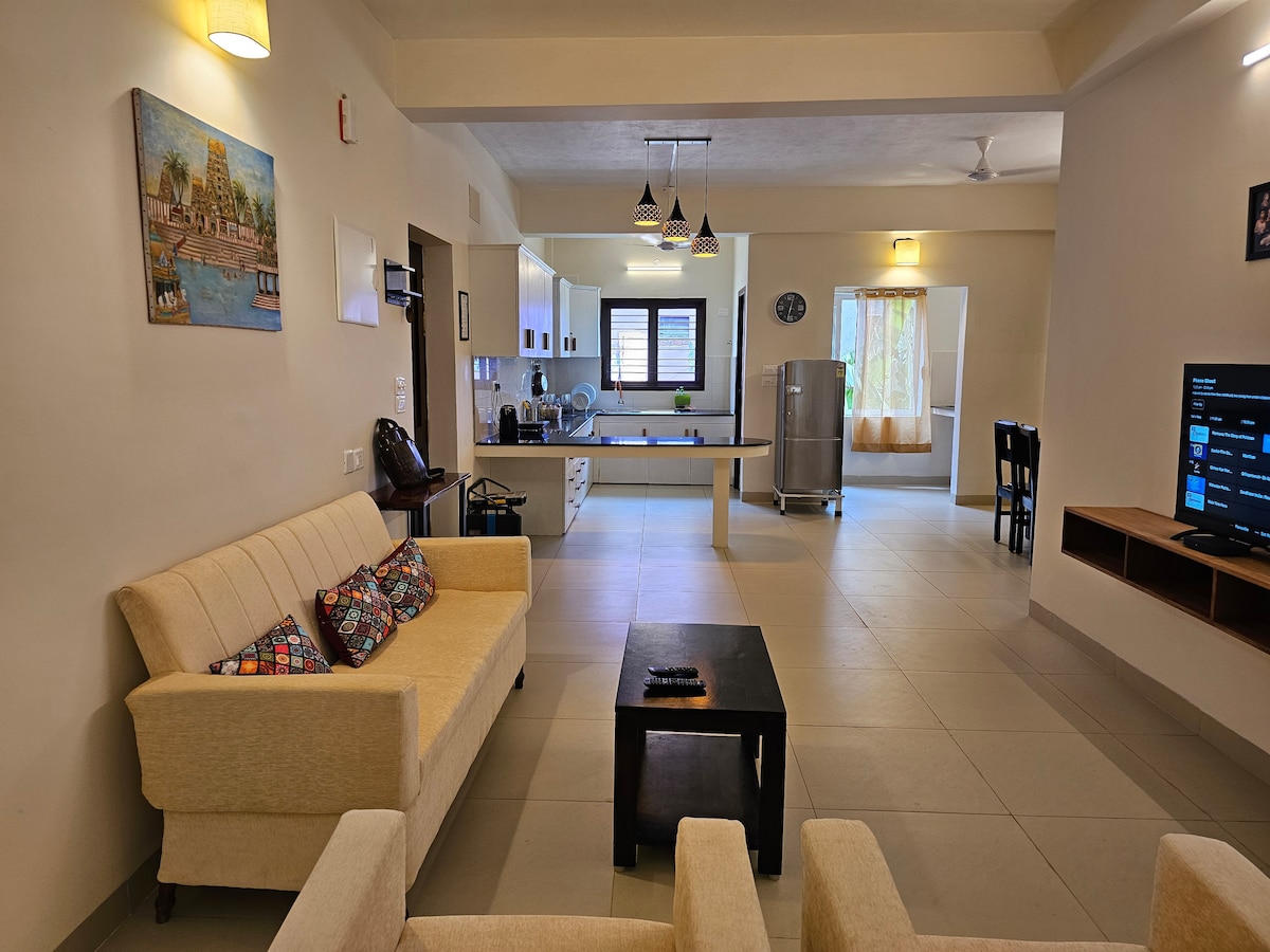 Sit back and relax in this calm, stylish space. Welcome to our designer apartment in the French town. A stone's throw away from the promenade and the Pondicherry's main market and famous eateries.The apartment has two air-conditioned bed rooms with attached bathrooms and balconies, and an air-conditioned living room with a sofa-bed. We have a fully equipped kitchen, a dedicated workspace, premium furnishings, ACs, hot water, linen and towels, a 50-inch smart TV, high-speed WIFI, washing machine.