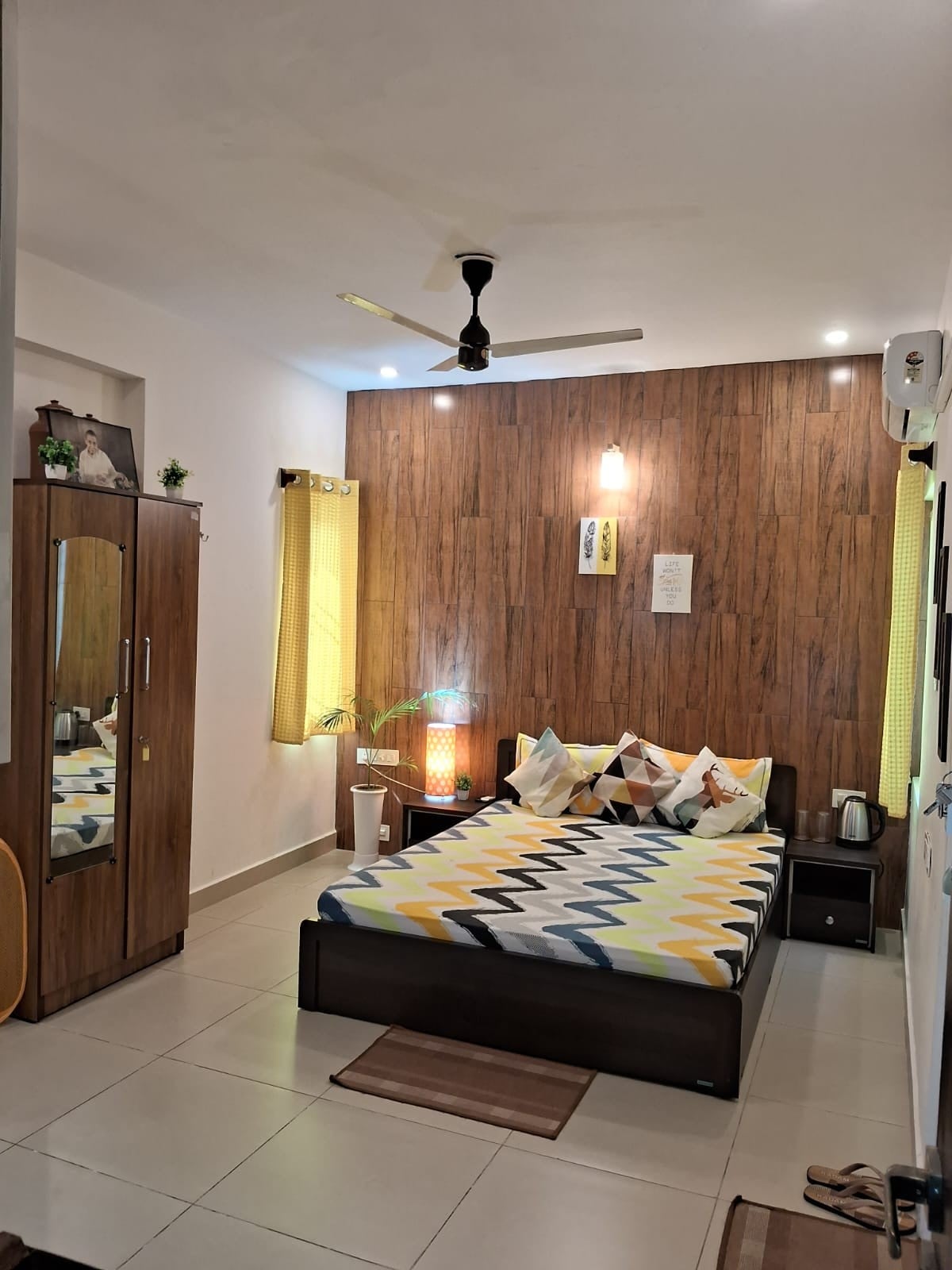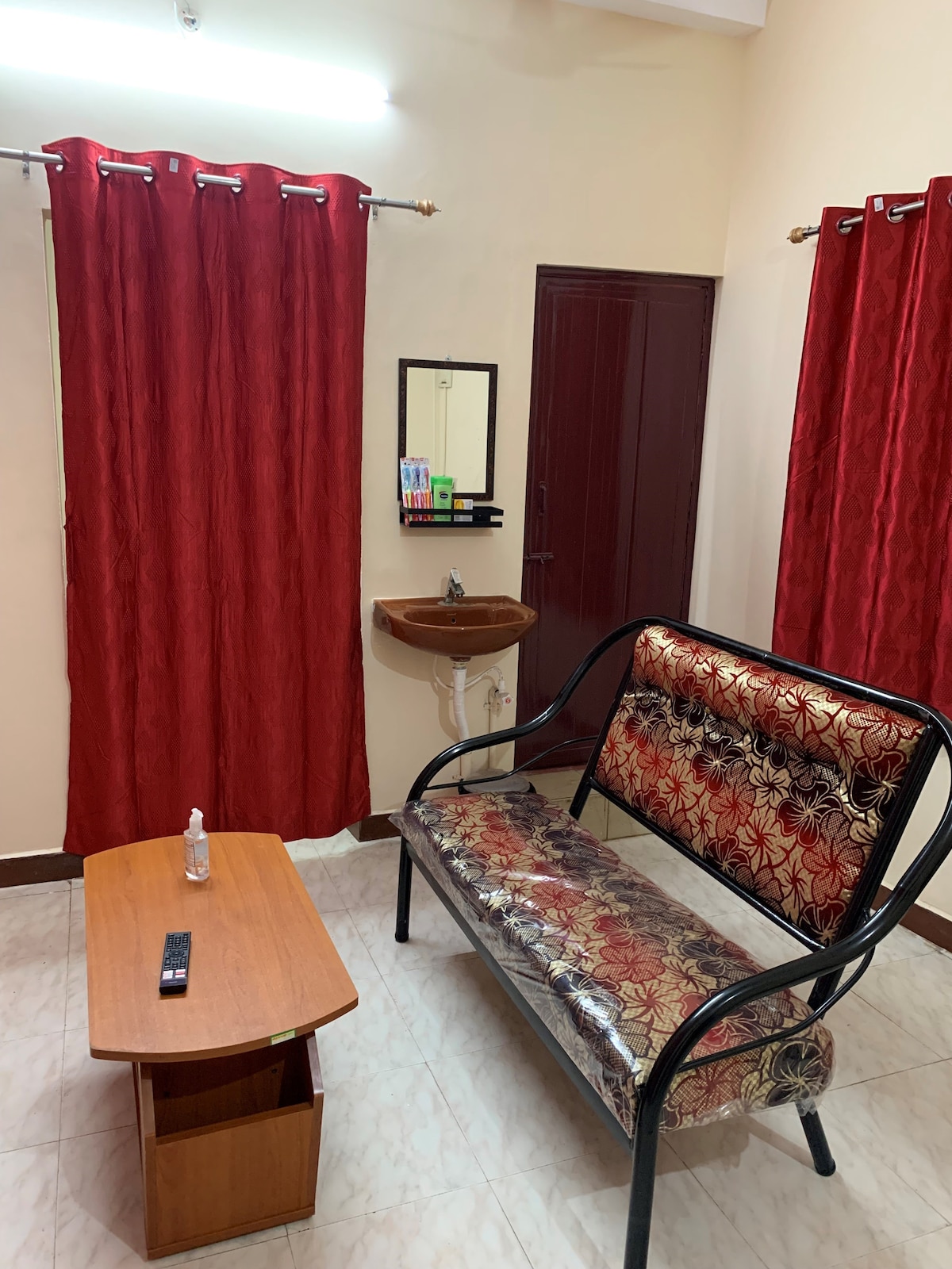 Completely Private with no sharing of any space, One Studio Room Small Apartment with a slab for kitchen & attached bathroom. New AC, cupboard, Queen bed with orthofoam mattress, ideal for two guests. kitchen area contains induction for cooking with utensils and cooking vessels. Hi-speed Internet connection for work from home Google TV with all Apps, AC, Fridge, Oven, Geyser, chairs, iron, etc, everything is there. Fully entilated place with 2 big windows. We need ID proof of all guests.
