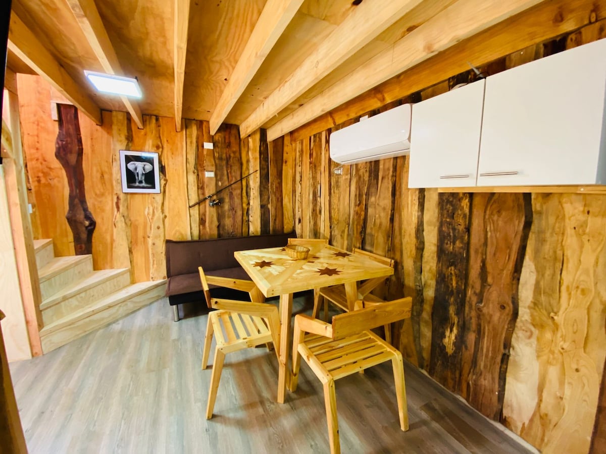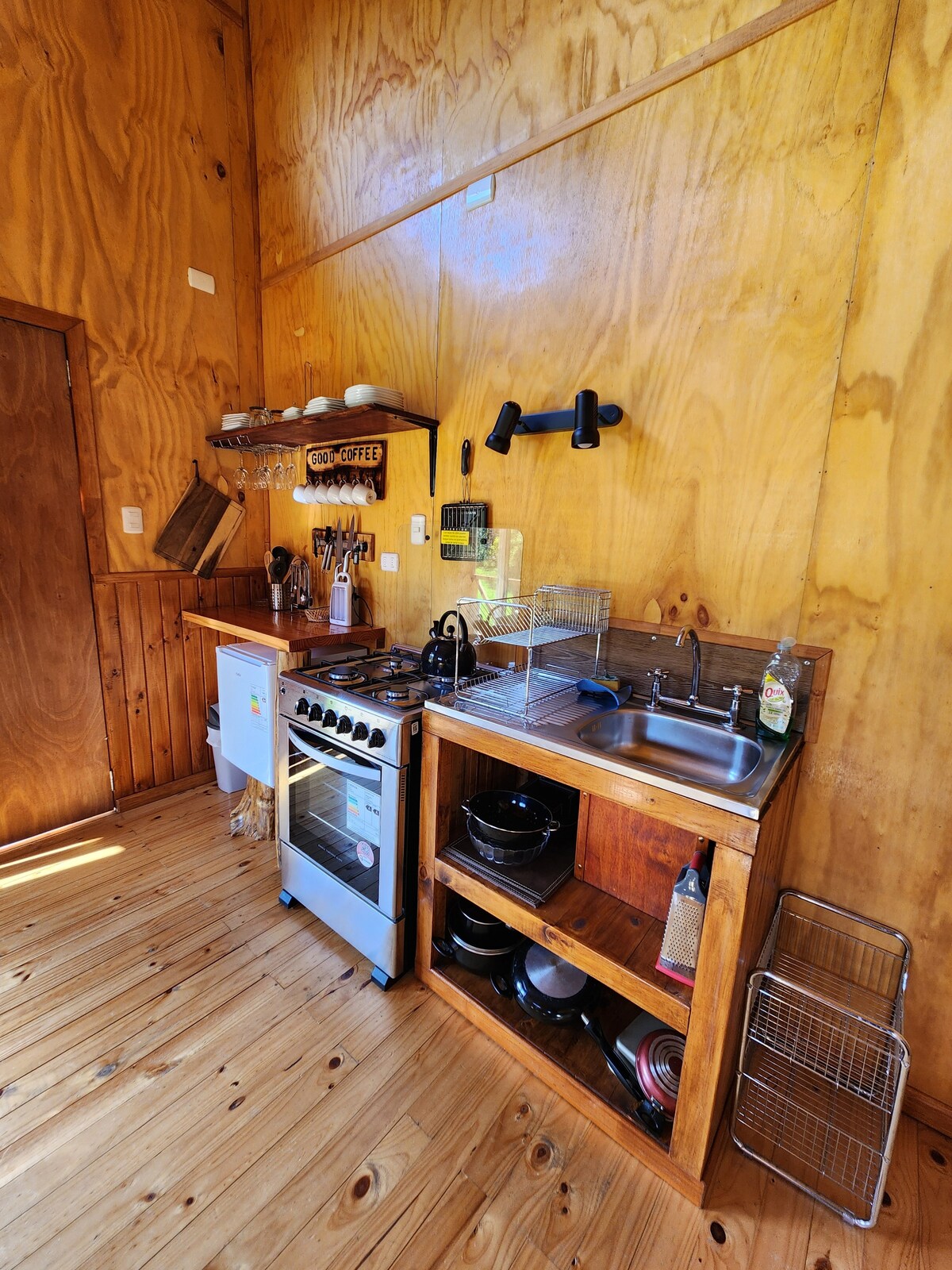 It is a rustic cabin, Tiny house type, sustainable for 2 people. VERY IMPORTANT: It has no TV, it has a small refrigerator, hairdryer, it has a wood-burning stove and air conditioning cold heat. It has a hot tub at an extra cost of $40,000 pesos. Surrounded by native trees, it was built trying to maintain balance with the surroundings. There is an outdoor stove. The town of Río Puelo is 1.5 kilometers away, and the Termas del Sol hot springs are 3 kilometers away