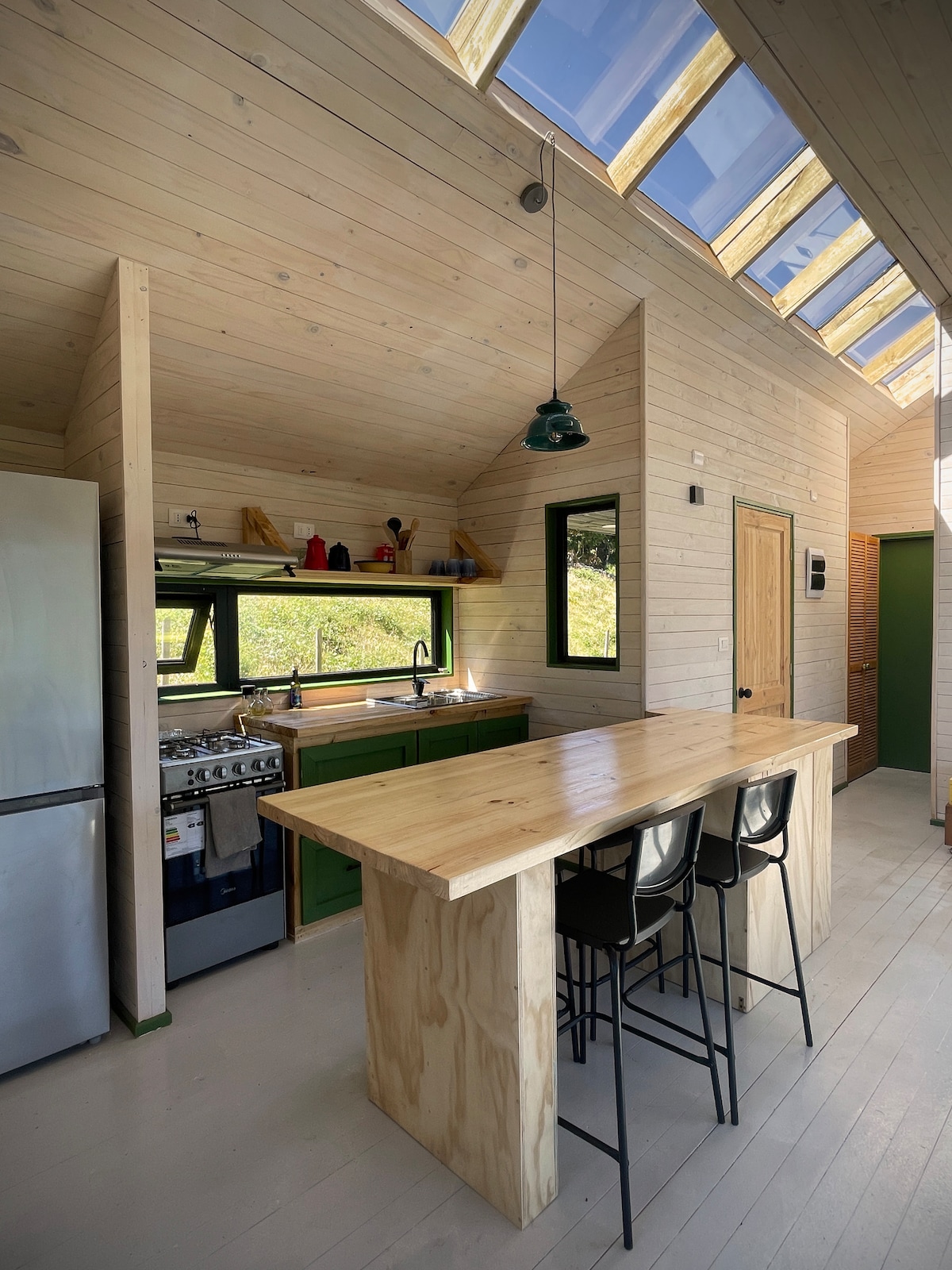 With a very nice view of the Reloncaví estuary, live a totally off-grid experience. The house is powered by solar energy and water from the mountains. The house is in the Cohiue de Los Columpios sector, right in the middle of the trekking that takes you to them. Access to the house door is by 4x4. For those who don't have a 4x4 to go up, I can tell you that I coordinated with the neighbors who manage the Cochamó swing.