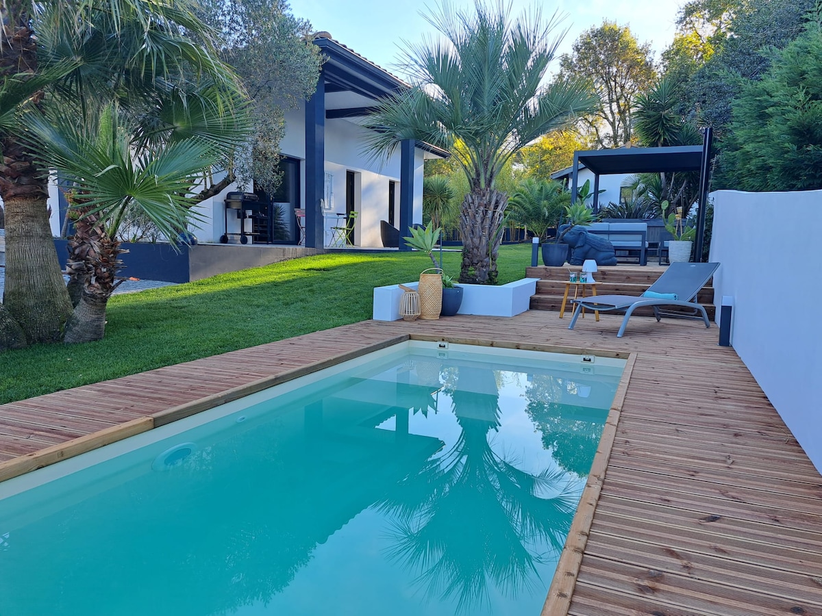 ONDRES, à 3km de la plage (navette gratuite à 20m et pistes cyclables à proximité), à 700m du centre-ville (tous commerces), pour 4 personnes, confortable villa récente comprenant 2 chambres (1 lit en 140cm et 1 lit en 160cm), 1 salle d'eau avec douche à l'italienne, cuisine équipée et séjour ouvrant sur une terrasse couverte avec jardin, piscine et jacuzzi privatifs sans aucun vis-à-vis. Barbecue à disposition. Possib. séance sauna (50€ en sus) Équipement et mobilier neufs. Calme et zénitude.