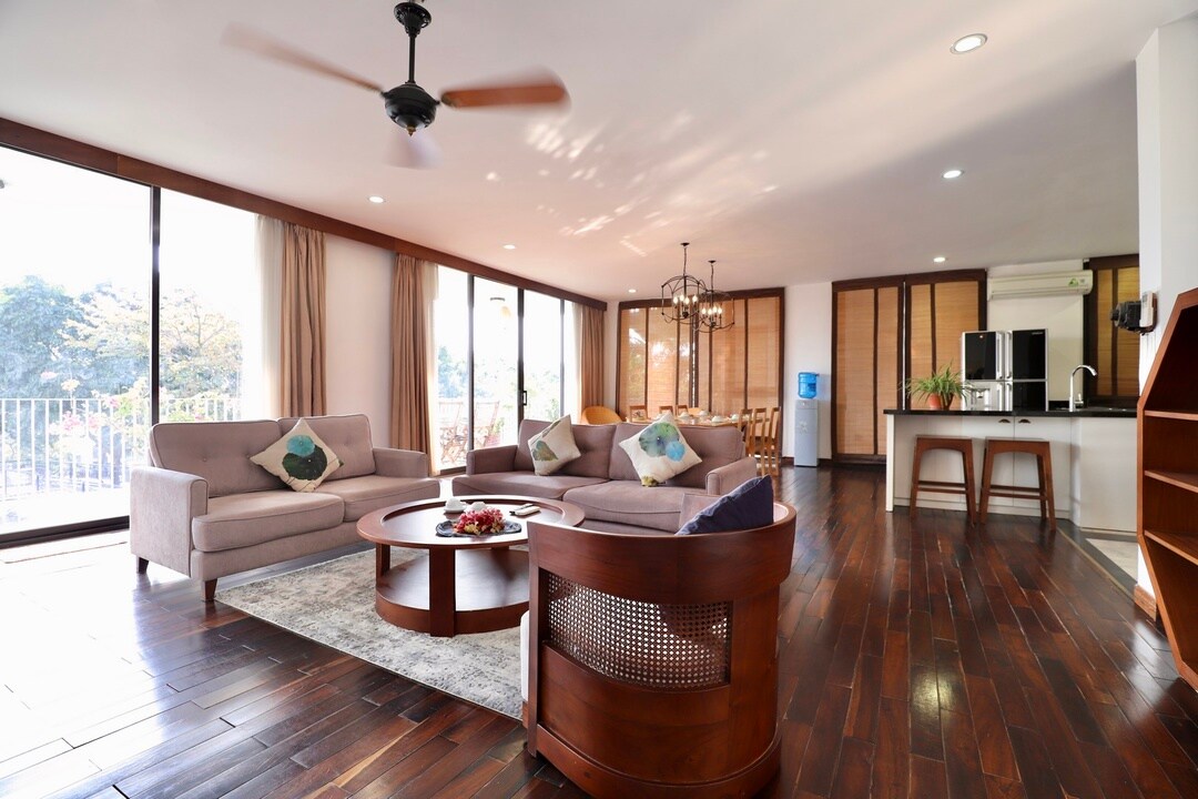 Relax in a peaceful apartment with stunning West Lake views on tranquil Yen Phu Peninsula. The spacious living room has a large, comfortable sofa for lounging or sleeping. A functional kitchenette with a washer/dryer ensures convenience. The bedroom includes AC, a flat-screen TV, and a workspace ideal for work or relaxation. Set in a low-traffic area, it offers a peaceful escape from the city buzz. The apartment perfectly combines the beauty of the lake with proximity to Hanoi’s dynamic streets.