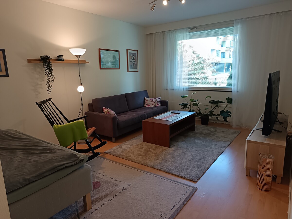 Kick back and relax in this calm and cozy space. New kitchen with new appliances, well-equipped, tastefully decorated studio. The bathroom has a washer and sauna. Two beds 90cm and 80cm wide. The apartment has a 43 inch TV and wifi. The flat is on the 2nd floor, no elevator. Free car parking in the parking lot. Nearby jogging trails and Mikkola shopping center is about 1.5 km away. Bus stop right next to the house. Key handover from our home (1km from the property) from the key box.
