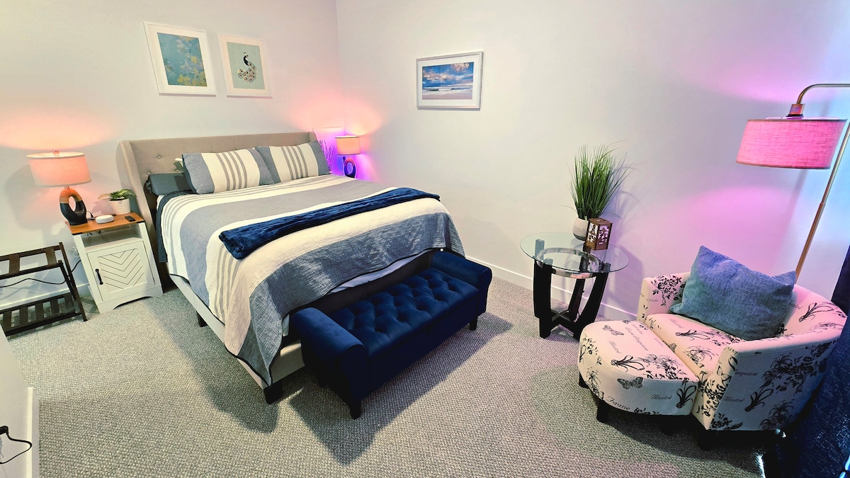 Relax in our completely private guest suite! It gives a comfortable hotel experience at a much lower rate. We provide driveway parking, a private entrance to your space, a cozy California King bed, luxury rain shower, closet, kitchenette, fiber internet, and smart TV. An additional youth size bed and playpen are available. We are proud super hosts and go above and beyond to provide a comfortable, clean, affordable, and safe stay for our guests.