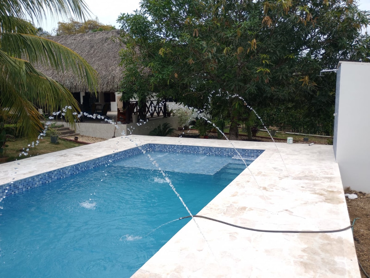 Beautiful country house in Turbaco Bolivar just 15 minutes from Cartagena, 40 minutes from Playa Blanca Baru, the country house has a hut, barbecue area, private pool, 3 bedrooms with air conditioning, 3 bathrooms, equipped kitchen, green areas for walking and fun. A magical place where you can connect with nature while having all the comforts of the city.