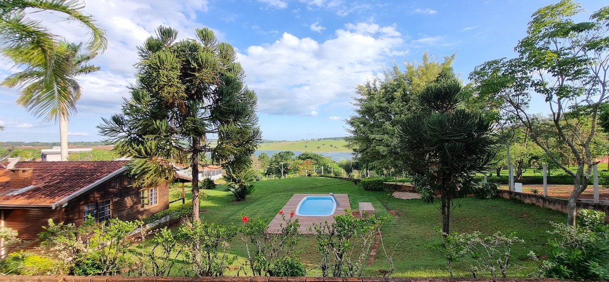 House in front of the dam with balcony, barbecue, living room, kitchen and 4 suites. The farm has a total area of 6,000 m² with open parking, as well as orchard and very green. Nearby there are hotels, restaurants, bakeries, mini-markets, marina and other facilities. The kitchen is well equipped with stove, microwave oven, duplex fridge, dishes, silverware, pots and pans. You'll love it. My space is good for couples, families (with children), and pets.