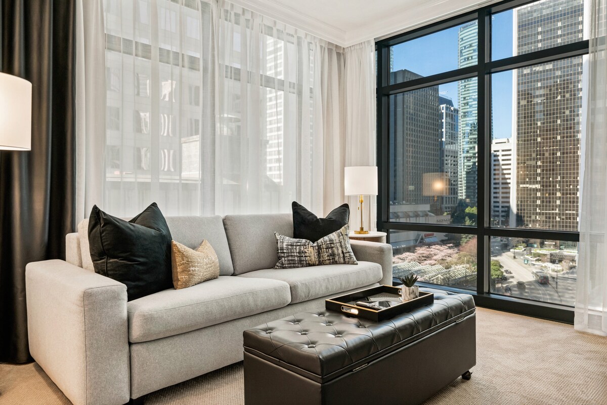 Suite Highlights: • ✅ Fully Compliant with city and provincial regulations • 🛏️ King bed + CB2 queen pull-out sofa • 🔥 Indoor fireplace & blackout curtains • 📺 Smart TVs in both rooms • 🚿 Full bathroom w/essentials • ⚡ High-speed Wi-Fi Kitchenette Includes: • ☕ Keurig coffee maker • 🥪 Microwave • 🧊 Mini fridge Prime Downtown Location: • 🚢 Vancouver Convention Centre & Cruise Terminal • restaurants, shops & cafes • 🚆 Close to SkyTrain