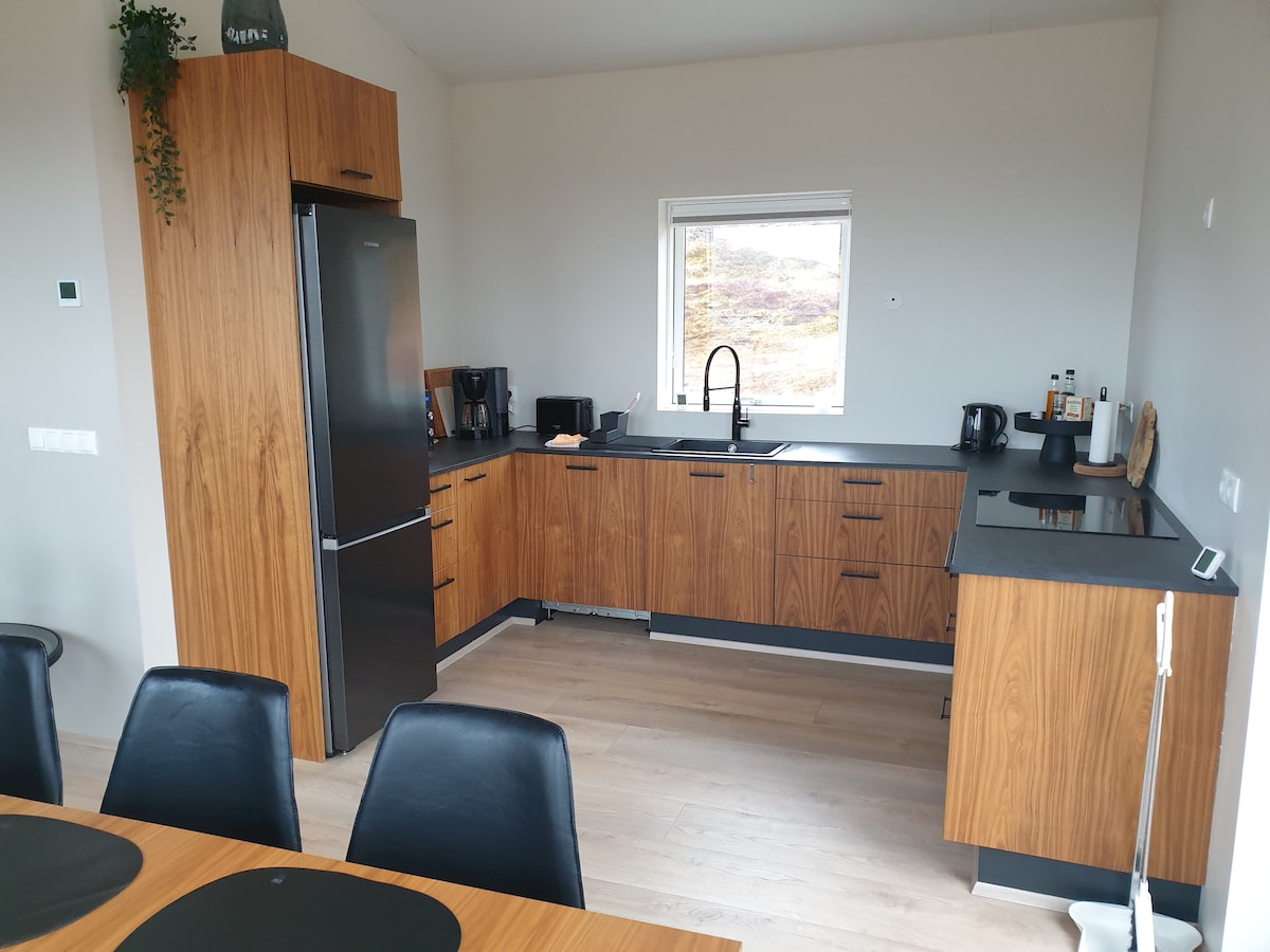 Wooden, warm house for six people. Perfectly integrated into the lava field at the foot of the extinct GRABROK volcano, which you can enter almost straight from home :). Beautiful views and silence. Only the sounds of nature can be heard. An ideal place to observe the northern lights (no city lights). Just 300 meters from the main road No. 1. Fully equipped kitchen. Perfectly clean drinking water flows from the tap. The jacuzzi is already working :) There are bubbles and it's nice :) !!!