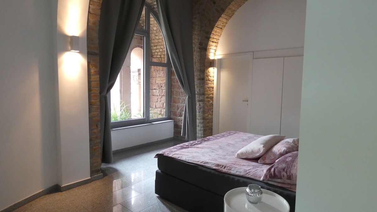 The Worms water tower is considered one of the most beautiful water towers in Germany. On the first floor, it offers a luxurious small city apartment (approx. 80 m²), which surprises with original round arches and plenty of light (6 large windows). Couples will feel comfortable here. You can have a cultural, sporty and/or romantic vacation. But business travelers will also find the opportunity to work online in peace and relax in a spacious ambience in the evening.