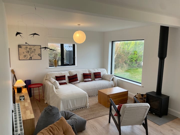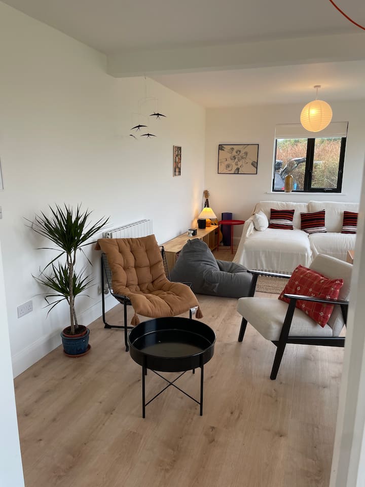 Our cosy modern cottage, with its sea-views and barrel, glass-walled sauna, will offer you a chance to enjoy one of the most beautiful corners of Ireland. Our large cosy sitting room, with its two large box windows, makes the most of this stunning location.