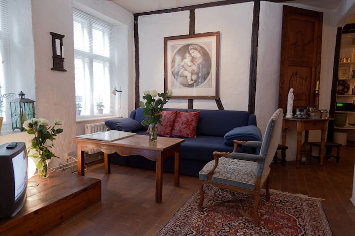Charming apartment located in the very heart of medieval Copenhagen, complete with bedroom, bathroom, kitchen, dining area and living room.