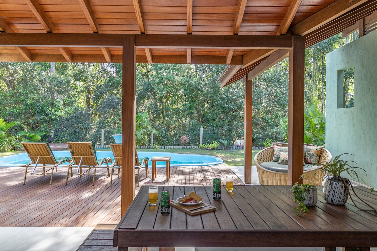 Our space is designed for our guests. We have a space measuring 1,500 m², a safe location, a complete and equipped house, a pool table, a heated pool, a whirlpool area, access to a private lagoon, a paddle board, a kayak, etc. Our location is privileged by natural beauty. We are located about 2 km from Praia do Rosa, but in addition to this beautiful beach, there are other beautiful beaches also in the region, such as Praia do Ouvidor, Praia da Barra de Ibiraquera, Praia do Luz, etc.