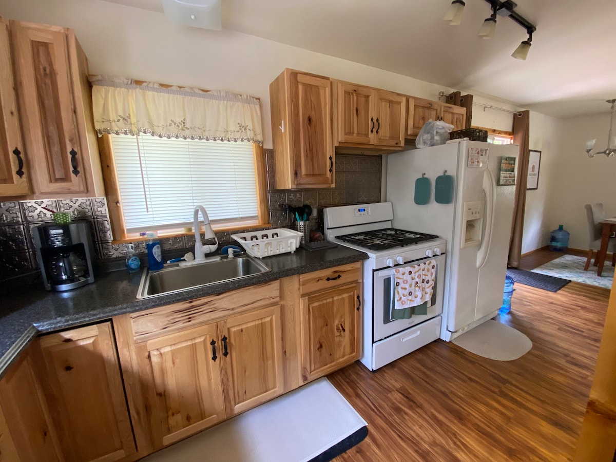 Our vacation property escape is super comfortable. It includes all dishes, pans, utensils you'll need. This 2 bedroom sleeps 6 easily with a bunk room, comfortable new pull out bed in the living room sofa, and a master bedroom with full bed. Fully stocked w/10 cup coffeemaker. Air Conditioning in the primary bedroom and living room area. TV with Live TV and Internet. Washer and Dryer. Great area for ATVs and trails only blocks away!! The deck/porch is spacious, featuring chairs and lounges.