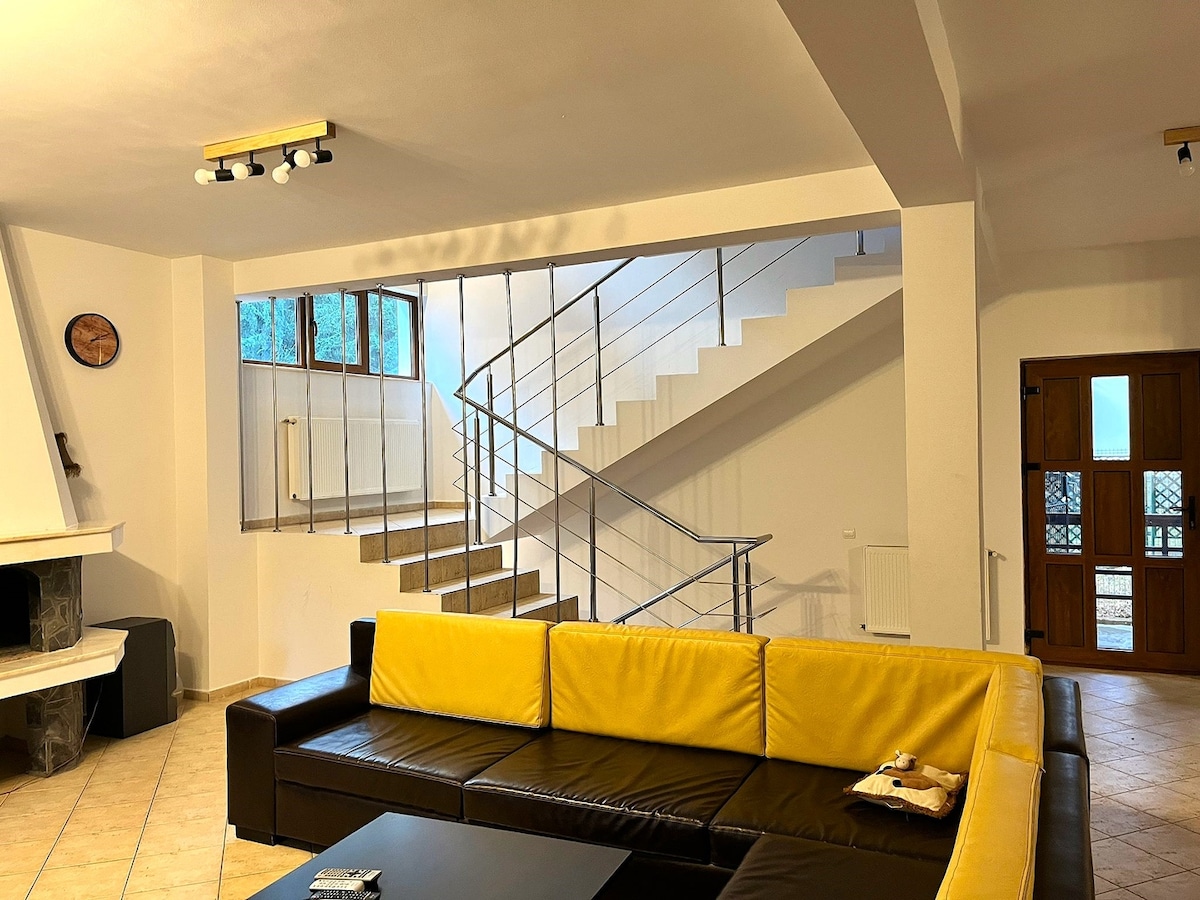 Escape to 5th Forest Villa in Predeal, a cozy forest retreat perfect for families and groups up to 8 guests. With 4 spacious bedrooms, 5 bathrooms (4 ensuite), a cozy wood fireplace, fully equipped kitchen, and large living room, enjoy relaxing moments on the terrace with a big dining table or in the front and back gardens. Cook BBQs, play music on the speakers, and immerse yourself in comfort, privacy, and the heart of nature. Private parking and all modern amenities included.