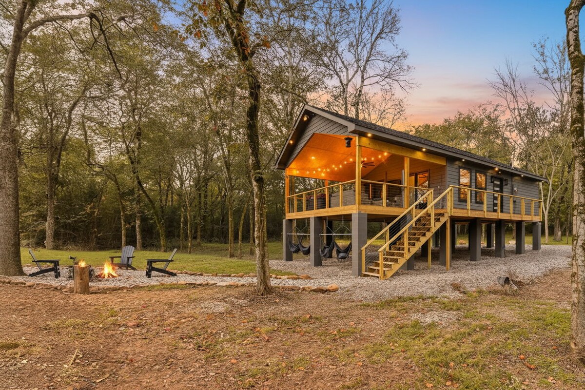 The Cedar Springs Cabin, located on the outskirts of beautiful Hot Springs, Arkansas, is a unique, one-of-a-kind experience. This beautifully crafted structure is rustic, yet modern. Enjoy gorgeous views from the top balcony or relax downstairs on the custom outdoor swinging bed. The property is perfect for a romantic couples getaway but also incredibly family-friendly with the outdoor game area and "buried bus" theater room!