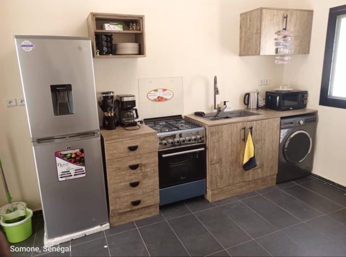 Ideally located in the heart of Saly, in a small residence with African charm. A peaceful haven 200 m walk from the most beautiful beach on the small Senegalese coast, departure point for all excursions, close to the golf course (5 min walk), close to all shops. This newly renovated apartment will seduce you with its tranquility, calm, amenities, neat decoration, and living spaces. Astou the housekeeper will take care of the housekeeping for the duration of your stay.