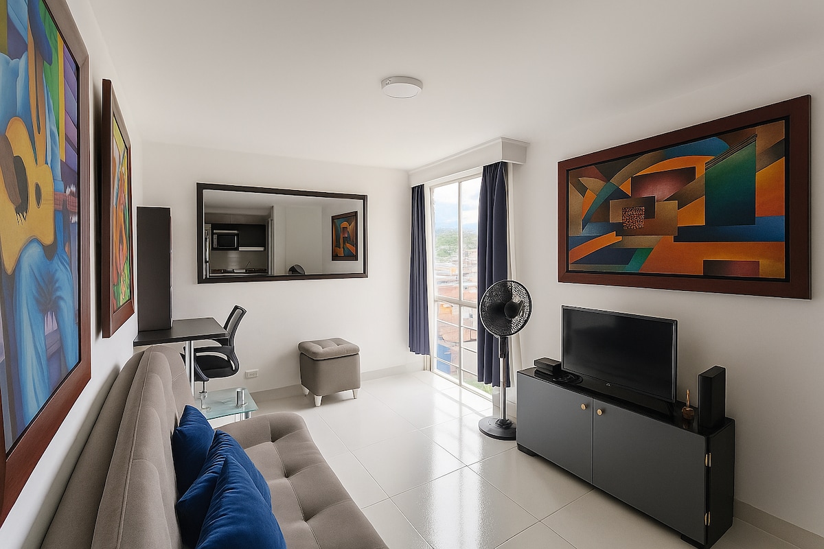 Beautiful Studio with a wonderful view of the mountains. It has a balcony with breathtaking views. Stay connected with our 300 MG stable wifi for working and enjoy your favorite shows on the smart TV. We have king size bed and washer. 24/7 Check in and security Pool and Gym in the building *Zero tolerance against sexual tourism. *Please see our house rules. * If you are Colombian you must pay IVA 19% additional.