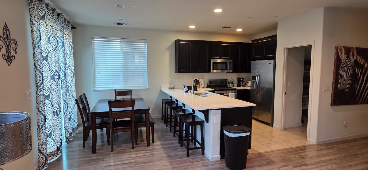 Welcome to your luxury retreat in Downtown Modesto! This fully remodeled 2BR/1.5BA Midcentury Modern home offers: • 1,150 sq ft of stylish double story home with spacious living space with new kitchen and baths • Large yard with paver-lined grass, Edison lights, and fire pit • 65” Smart TV, 1200mbps WiFi, 4K security system, and smart garage • Queen bed with desk, plus two twin beds, all with premium linens • Walking distance to fine dining, nightlife, and attractions