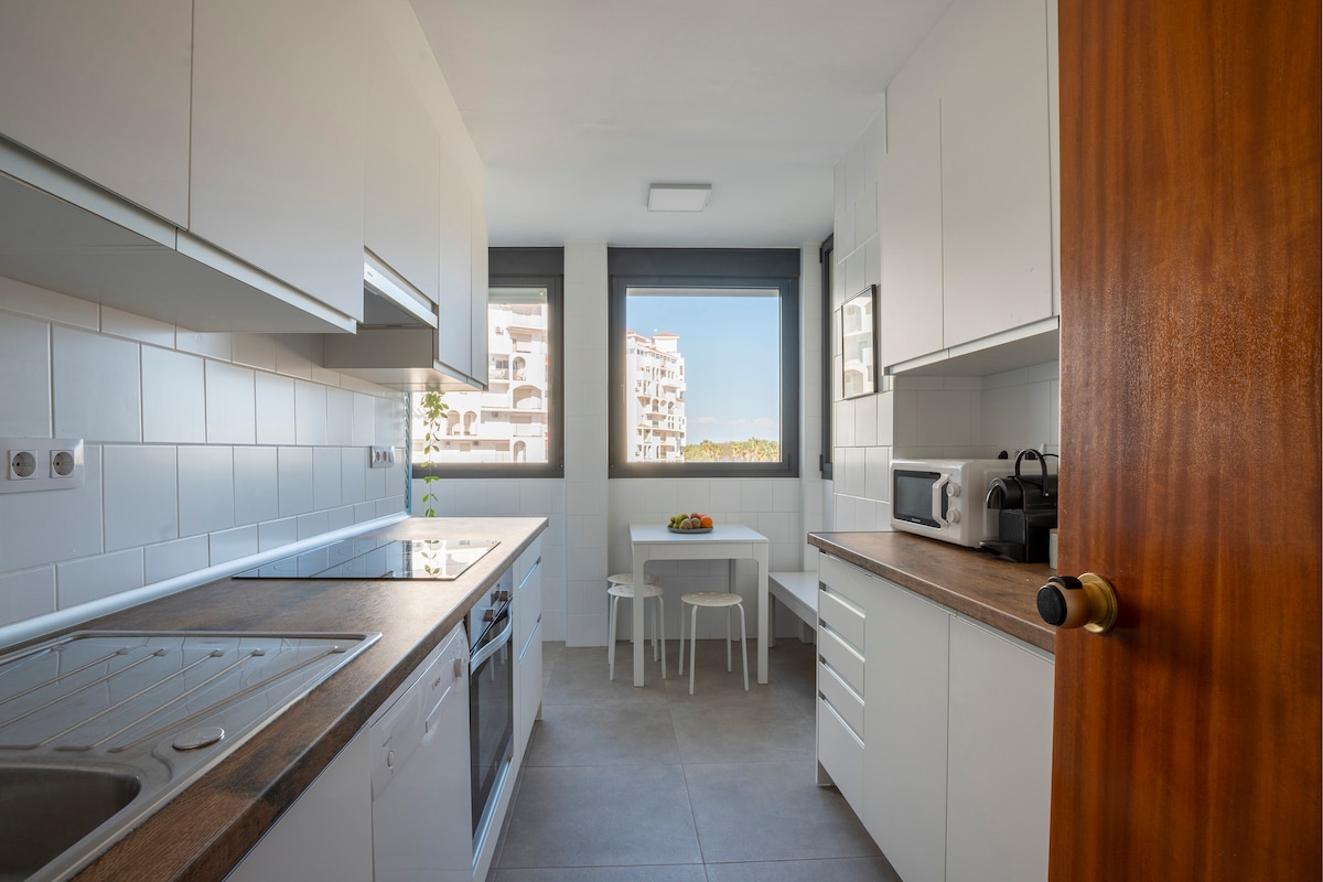 Wonderful apartment, next to the Turuños Natural Park, in the center of the Bay of Cádiz, consists of a bedroom with a 150 bed and a sofa bed, full bathroom and separate kitchen, in a luxury development, beach 100m away. We have increased our strict cleaning and disinfection measures. Pool open from June 20 to September 18. Pets are not allowed.