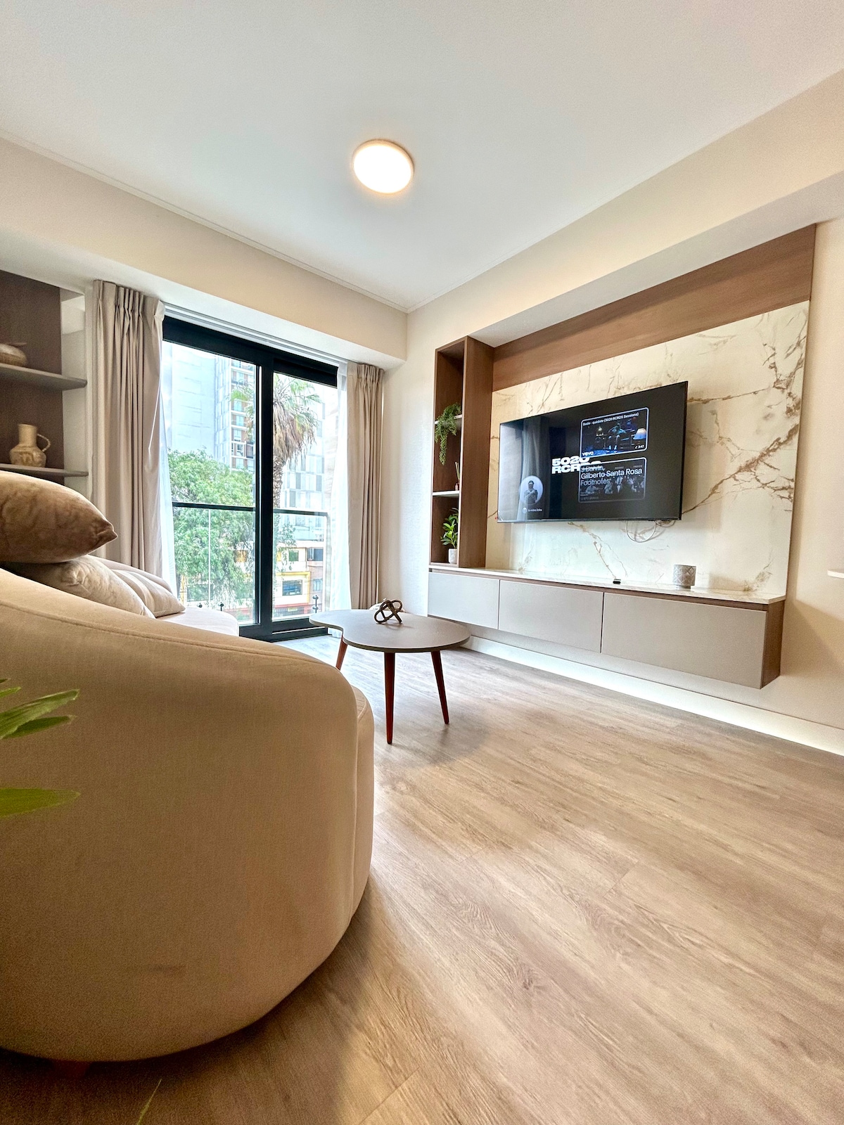 Modern apartment that combines contemporary design and comfort. It has a bright room connected to a private terrace with modern chairs and floors, ideal for relaxing. The equipped kitchen includes modern appliances and a dining room with marble table. The master bedroom has queen bed, a spacious closet and TV. In addition, it offers Wi-Fi ,access to the building's pool and lavaseca, perfect for long or short stays. *ask about parking availability