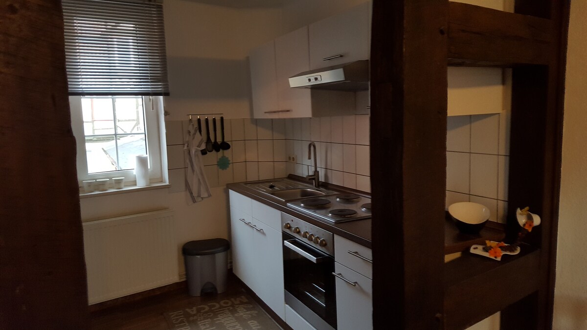 Modernisierte und gemütliche 75 qm-Wohnung in einem gepflegten Fachwerkhaus aus dem 18. Jahrhundert. Es steht eine große neuwertige Küche und ein modernes Bad mit ebenerdiger Dusche zur Verfügung. Im Wohnzimmer steht eine neue Schlafcouch mit Ottomane. Für eventuell eine 3. Person. Das Schlafzimmer hat seit neuestem ein Boxspringbett ( 180x200cm) und ein Kinderreisebett kann auch noch bei Bedarf aufgestellt werden.Des Weiteren eine Terrasse mit neuen Sitzmöbeln und einer Markise