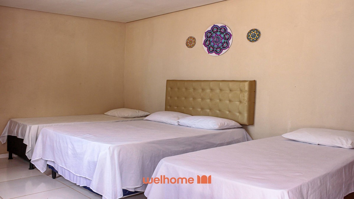 02 quartos - 1 casal com ar e outro com 02 cama de solteiro com ventilador. Cozinha, sala de estar, varanda e banheiro com chuveiro elétrico, Wi-Fi e garagem.