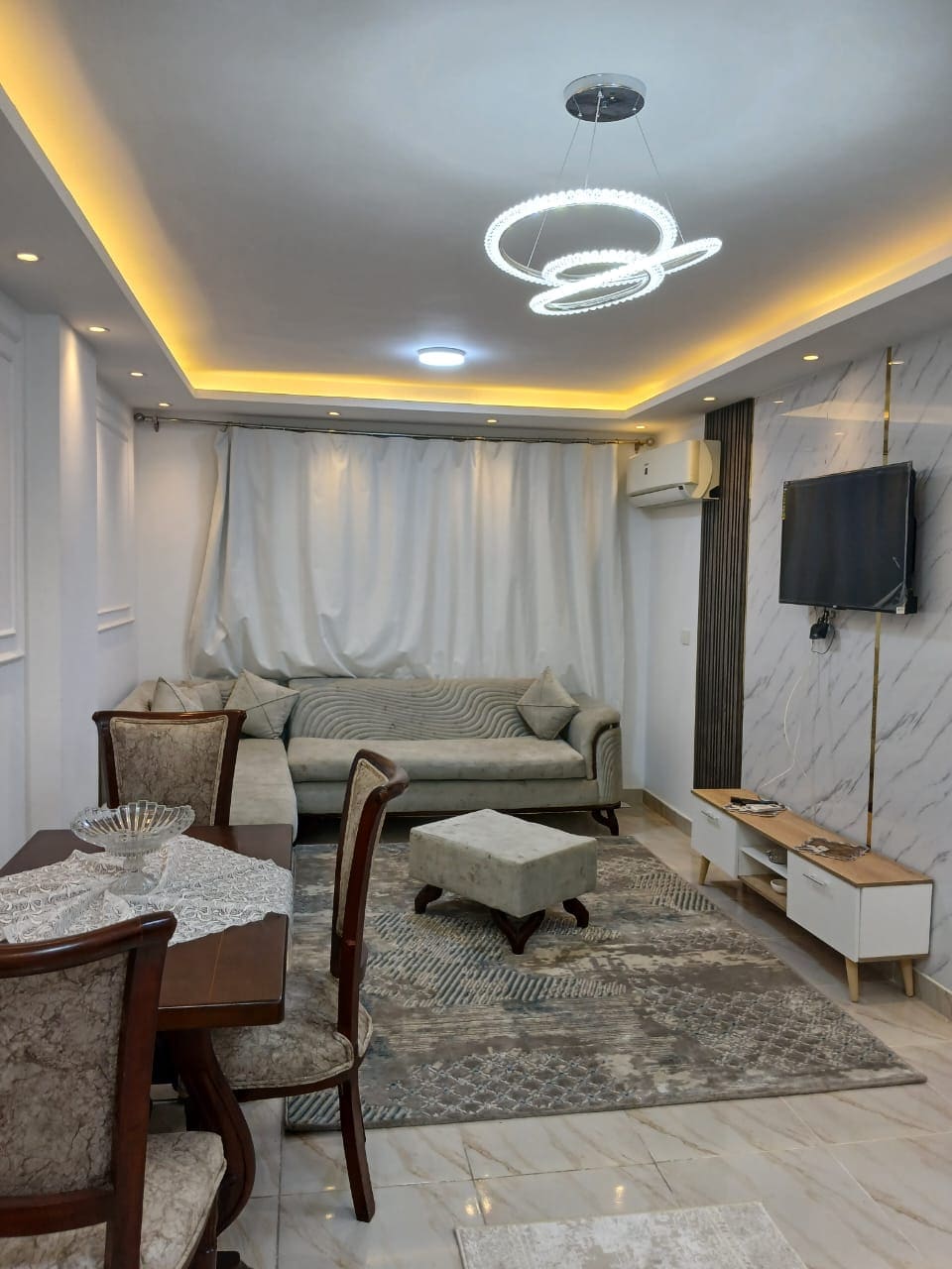 Enjoy a stylish experience at this centrally-located place at the heart of New Cairo. This gated community with 24 hour security, grand supermarket, gym, shopping mall, a pharmacy , beauty center, indoors garage, restaurants, coffee shops and pedal courts. This elegant upscale compound is a walking distance to everything from Starbucks, cinema to fancy restaurants and malls. With 3 TV, Netflix service and High speed Wi-Fi, you will always be connected. Fully furnished with all necessities.