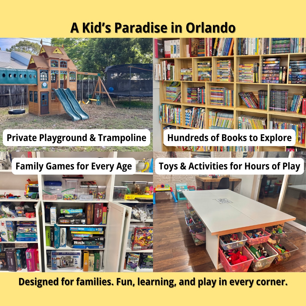 Modern 3‑bed, 2 bath family retreat less than 30 minutes to Disney & Universal, 8 min to chic Winter Park. Spread out in the open‑plan living/dining, cook in the chef’s kitchen, binge board games or 1,000+ LEGO bricks, curl up with books, or crush a workout in the garage gym (rower, rack, bench, free weights). King suite + kids bunk w/ slide + queen sofa. Backyard play‑park, trampoline, swings, grill & shaded picnic. Fast Wi‑Fi, smart TV, espresso bar, parking. Ideal for families & work‑cations.