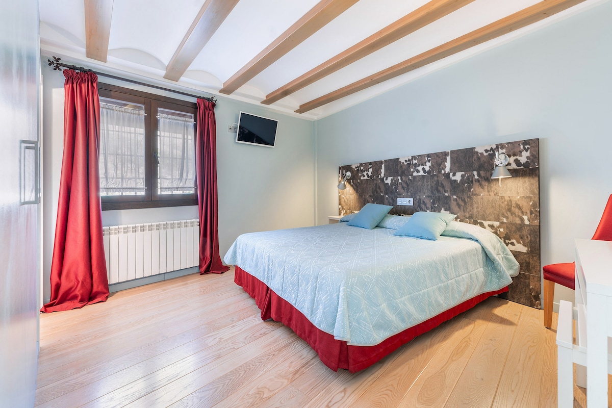 Habitación 4 QUIES, en la segunda planta, es un espacio pensado para quienes buscan silencio y confort en cada detalle. Ideal para viajeros solos o parejas, dispone de dos camas de 90x200 que garantizan un descanso reparador. Su ambiente amplio y luminoso se completa con baño privado con ducha a ras de suelo. La decoración combina encanto rural y diseño actual, creando una atmósfera cálida y acogedora, con TV de pantalla plana para una estancia cómoda y sin prisas.