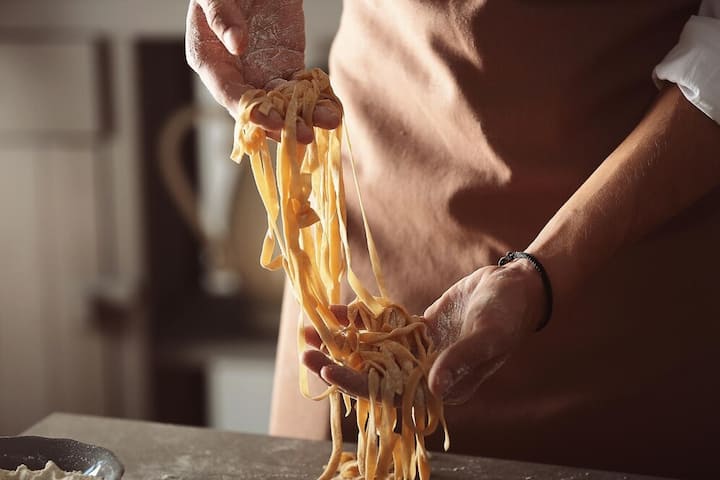 Preparation of fresh pasta to take away or cook and eat immediately. You can have a glass of wine, a coffee, or a drink.