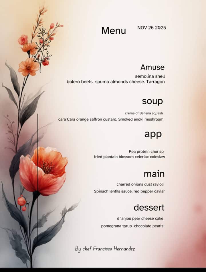 I offer a high-quality 5-course tasting menu, 5 or 8-course amuse appetizer, intermezzo. entree, and dessert.