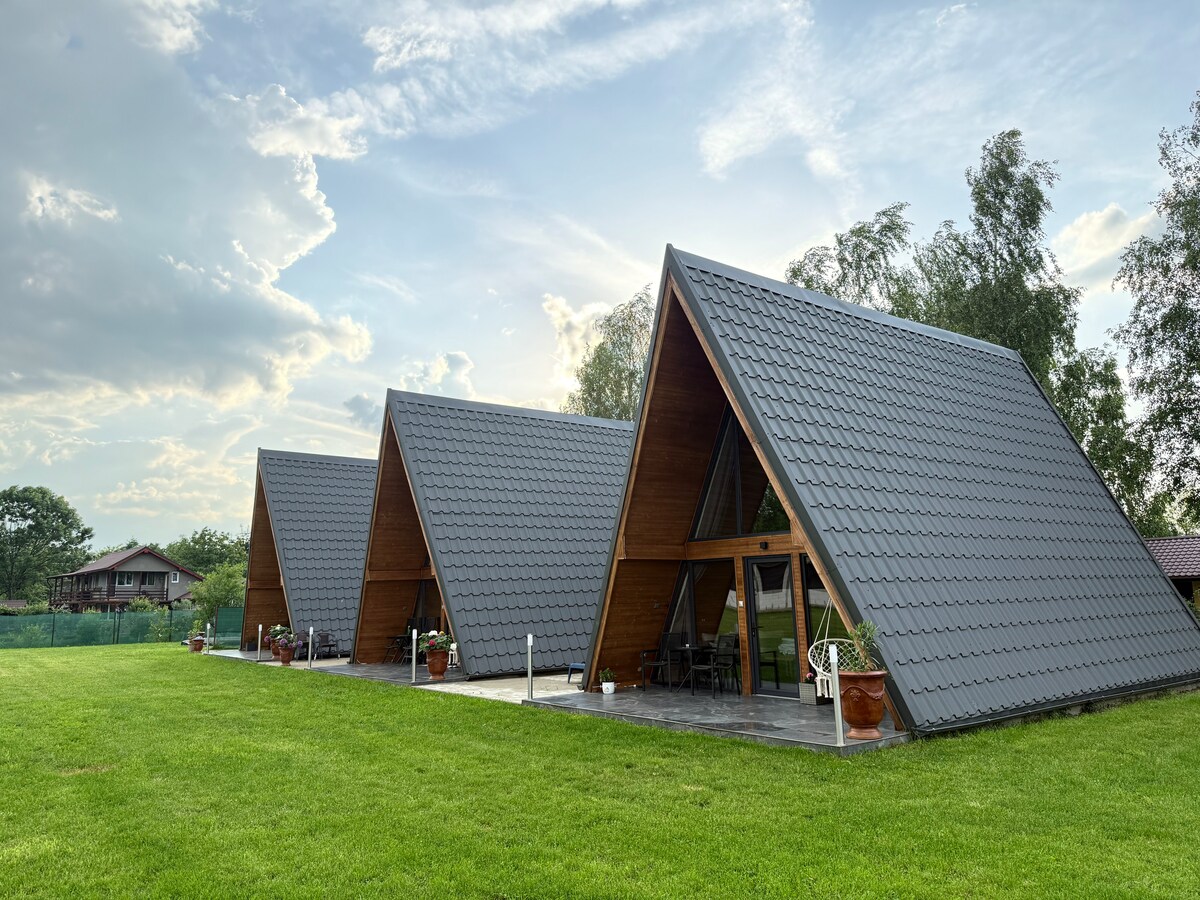 Vă invităm să descoperiți 3 căsuțe A-frame identice , perfecte pentru evadări în natură și momente de liniște. Fiecare căsuță are un design modern , dar păstrează farmecul rustic al vacanțelor în mijlocul naturii. Capacitate : până la 4 persoane/căsuță Pat dublu+canapea extensibilă Bucătărie complet utilată Baie Zonă de grătar Locul ideal pentru familii , cupluri sau grupuri mici de prieteni care doresc să se bucure de intimitate , liniște și aer curat , fără să renunțe la confort.