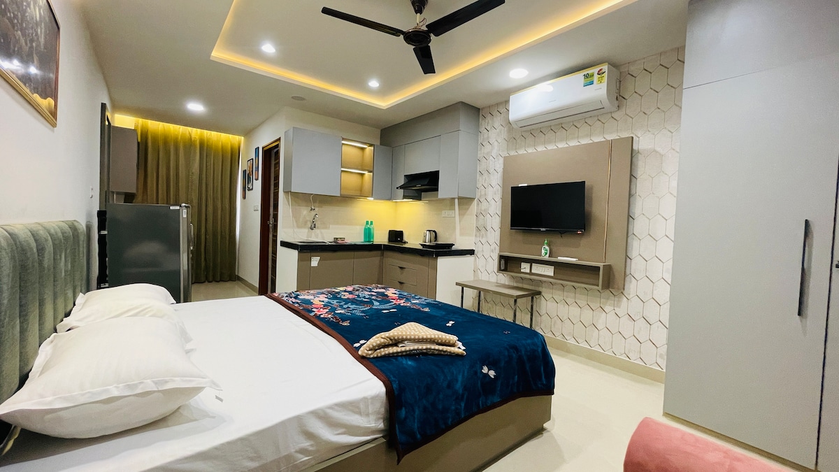 š” Welcome to Your Jaipur Stay Step into a modern, thoughtfully designed 1 BHK apartment in Jaipurās well-connected neighbourhoodāJagatpura ⨠Comfort Meets Convenience ⢠Bright living area with Smart TV & internet ⢠Plush bedroom for restful sleep ⢠Air-conditioning in all rooms ⢠Fully equipped kitchen & washing machine ⢠Toiletries, hair dryer and fresh towels ⢠Ideal for short & long stays š Prime Location Centrally located with malls, restaurants, shopping, entertainment - 2 minutes away