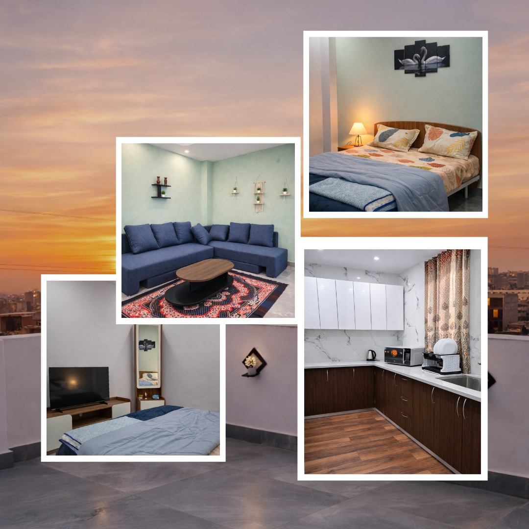 Escape to Predators’ Terrace – a stunning 2BHK retreat featuring an open terrace, modern amenities, and lift access. Step into a world where bold wildlife art meets contemporary elegance. Sip wine under the stars, unwind in the chic lounge, or start your morning with a coffee on the sunlit terrace. Perfect for couples, solo travelers, or stylish getaways — this space blends romance and comfort. Your perfect escape awaits — where nature meets luxury in the heart of the city.