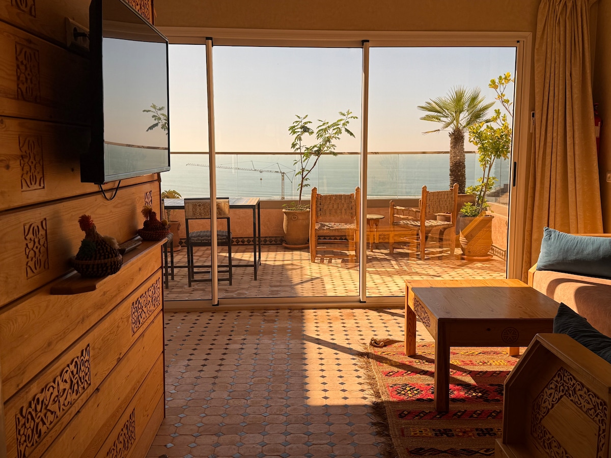 Enjoy a bright and cozy one-bedroom apartment with panoramic ocean and sunset views, located in the heart of Taghazout Bay. Perfect for couples, surfers, digital nomads or anyone looking for peace, comfort and quality time. • Ocean & sunset view from the balcony • 5 minutes walk to the beach • Pool, playground & football field inside the residence • Fast Wi-Fi • Secure gated community with 24/7 security You will enjoy the perfect mix between calm, ocean vibes, surf energy and comfort.