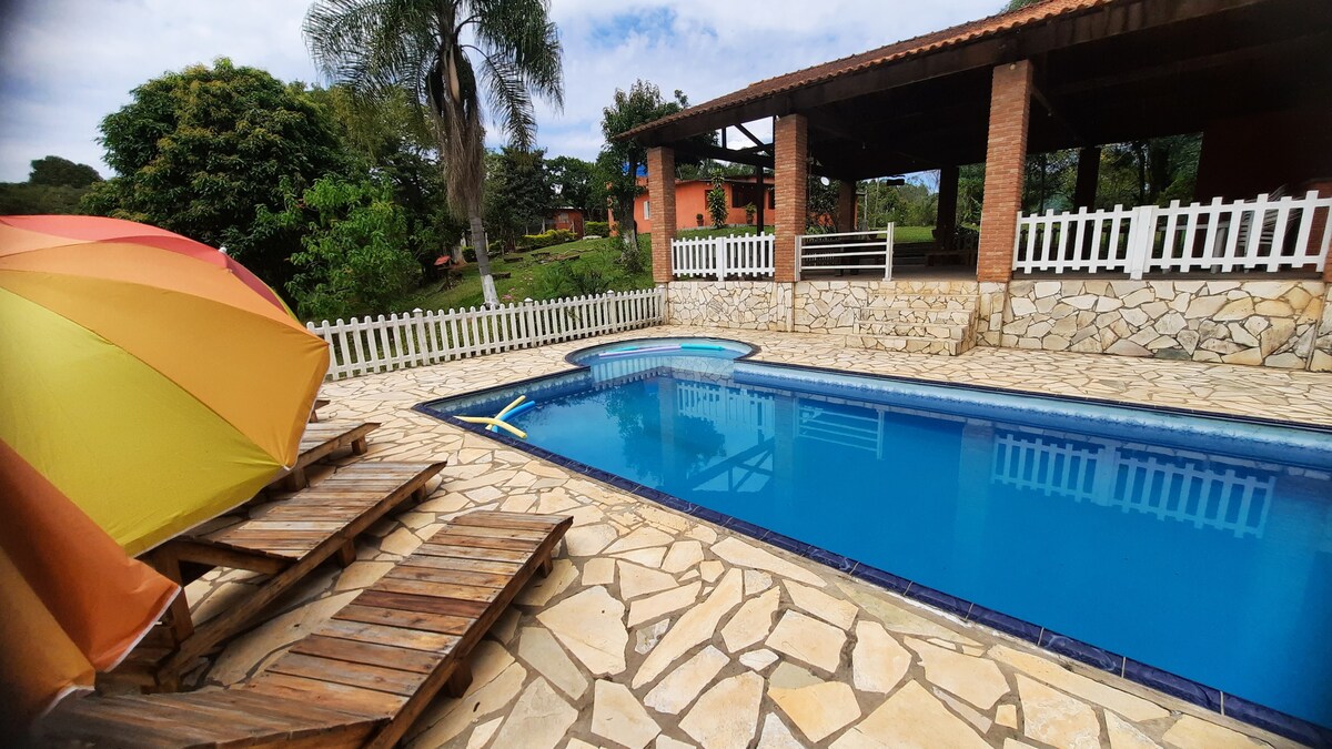 Country house: with a view of the mountain, it is ideal for those who want peace and tranquility. The location provides a direct interaction with nature, with a privileged view. * 1st Bedroom: en-suite with 1 double bed and 2 bunk beds * 2nd Bedroom 1 full bed * Trundle bed in the living room * Full and equipped kitchen. * Lounge, games table, playground, wood-burning stove, barbecue, soccer field, swimming pool with beach, TV (200MB fiber Wi-Fi) Ideal for 10 people. We do not provide linen or bath towels.