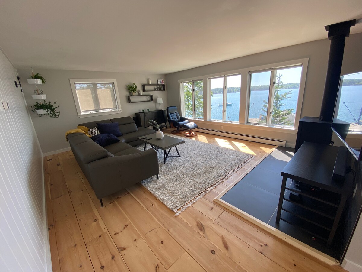Located at the end of a private road you will find the area very peaceful with beautiful ocean view sunrises and sunsets and lots of wildlife sightings. This cozy 1000 square foot apartment has been recently renovated for a clean coastal vibe. The house was originally hand built in 2000 by the owner. You will notice the craftsmanship detail, built ins, hand made furniture and unique nautical style throughout the apartment. The kitchen is fully stocked and equipped with stove, full fridge and a new microwave and dishwasher. The living space provides a 50 inch smart TV and queen pull out sofa. Enjoy the vast ocean views from the large living room picture windows. Watch the boats cruising through Penobscot Channel or a local lobsterman hauling their traps. The bedroom offers a queen bed and plenty of closet/storage space. There is a large jacuzzi tub and separate hand tiled shower in the bathroom. Spacious deck off the kitchen/living area provides an outdoor dining area and grill. Enjoy dinner or drinks taking in the salty ocean air and views. At the base of the entry stairs is a separate patio space with propane fire pit shared amongst both living spaces. Located behind the apartment is an adorable playhouse with slide, saucer swings and a rock climbing wall that is shared amongst the neighborhood. Please play at your own risk. WiFi included