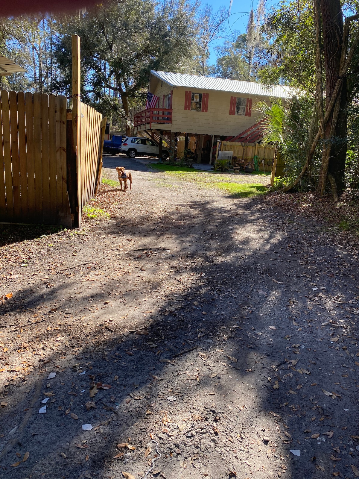Pristine location!! Rustic house on stilts. lots of parking and under house protected parking. If your looking for peace and quiet this beautiful home is nestled away to give you plenty of privacy. You will be able to walk out to the back porch and watch nature take place with all the birds, squirrels, owls and occasional hummingbird. You are within several miles of historic downtown Fernandina, beaches, pristine beaches