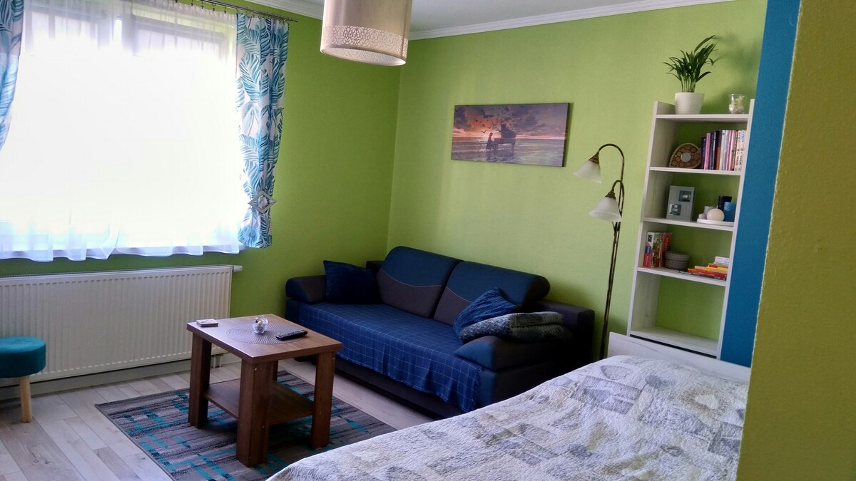 An apartment in the city center, where there is a living room with a large sofa bed and a kitchenette, a bedroom (a total of 4 beds) as well as a bathroom and a hallway. The apartment is fully equipped. The block is monitored. The advantage is also its location. It is located away from busy streets, but close to, for example, a shopping mall (800 m), a sports hall at Struga Street (200 m), or Leśniczówka Park (200 m). The distance to the railway and bus stations is about 2000m.
