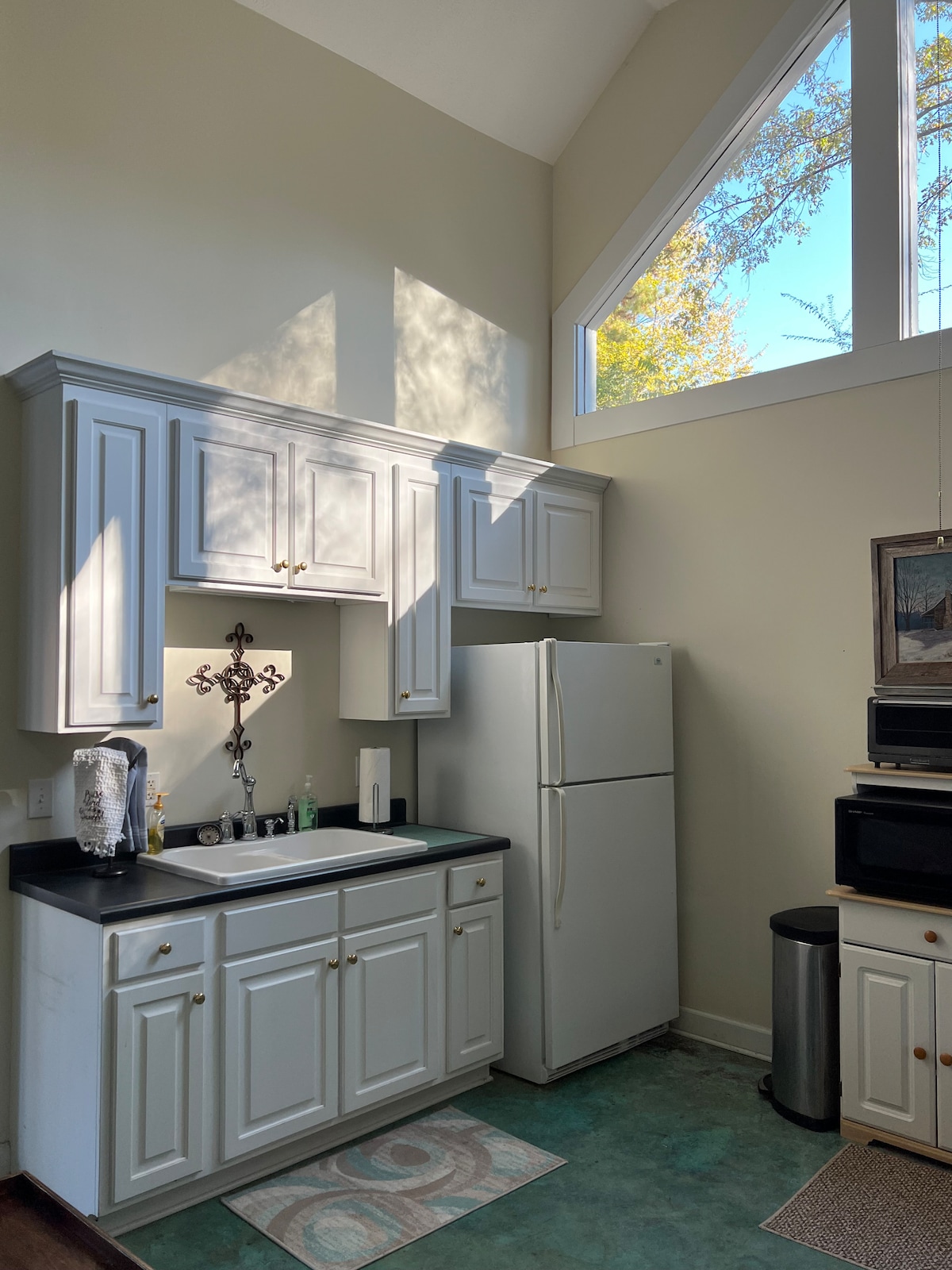Nestled in a beautiful barndominium on several acres, our charming 1 bedroom/1 bath condo offers the perfect blend of elegant and modern comfort. The open concept living area features a large, lush sofa and swivel chair, a large flat screen tv, and sky light windows that flood the space with natural light. The upstairs loft is spacious & has a large queen bed & twin bunks. Our house is only minutes away from Mississippi State University making us the perfect escape to revisit time & time again!