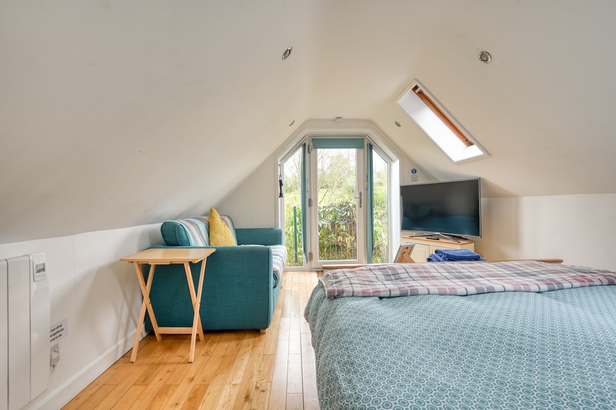 Newly fitted out separate self contained annexe in the heart of the beautiful Vale of Belvoir. Downstairs is a well equipped modern kitchen. Upstairs is a large studio-style space which is light and airy, with a separate shower room. There is a king size bed, also a sofa bed which would sleep another adult or two children. Stair gate, high chair and travel cot available if required. Parking on drive. Also plenty of space for bikes. In a lovely village with good amenities and country walks.
