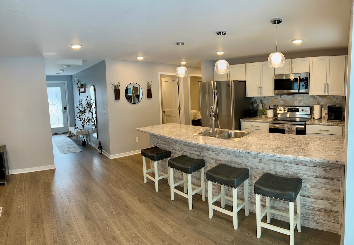 Escape to your private, super-clean Green Bay retreat! This recently refurbished 2-bed/1-bath duplex side comfortably fits a family or small group. Features a King & Queen bed, fully stocked kitchen, and a cozy living area. Enjoy the convenience of a private garage and a patio with a grill. Located in a quiet neighborhood, just a 14-minute drive from Lambeau Field. Perfect for a family vacation, getaway, or work trip.