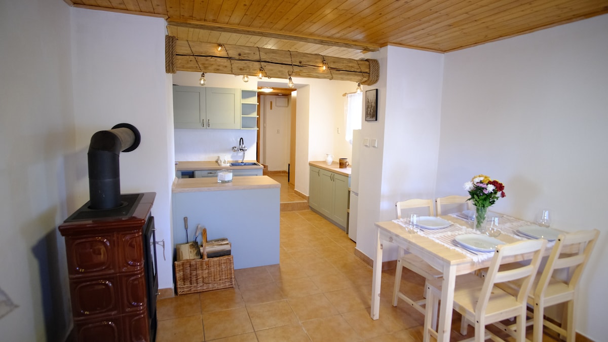 The stone house is over 150 years old and is furnished with historical furniture. It is located in a picturesque village with no car traffic, in the Blanský les Protected Landscape Area. The surrounding pristine nature invites peaceful walks. In our orchard, two horses graze, and in the herb garden, you can pick mint and lemon balm to brew tea. For breakfast, you can taste our homemade cheese, seasonal vegetables, and homemade bread from our neighbor. The apartment was renovated in July 2024.
