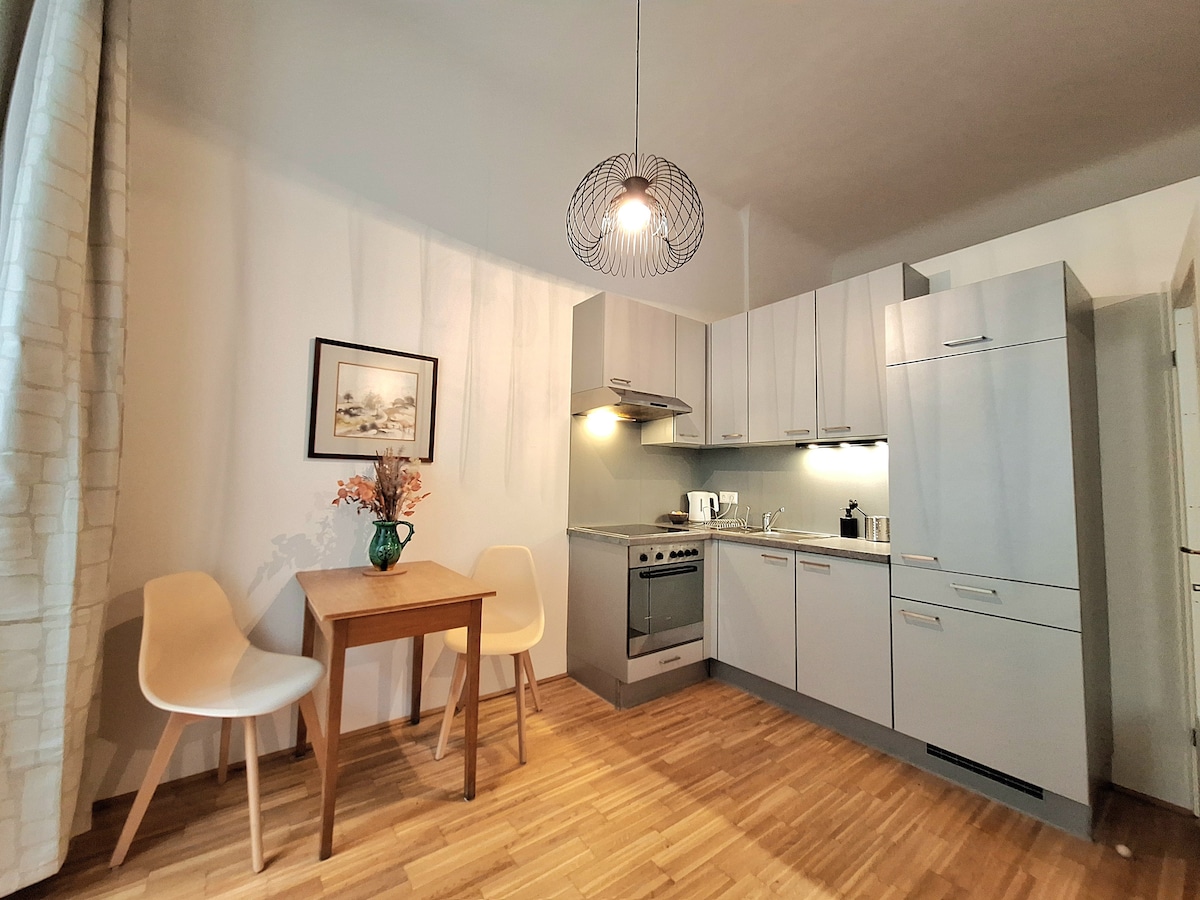 The completely newly furnished 50 m² apartment is centrally located on Jakominiplatz near the main square or the shopping street Herrengasse. The apartment has a living room with kitchen and dining area, a separate bedroom, a bathroom, a private toilet, storage room and anteroom.