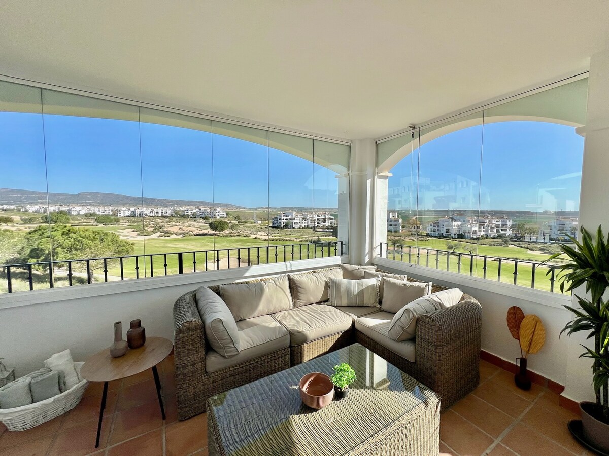Your sunny escape at Casa Sofinata — terrace apartment with pool and golf views in Hacienda Riquelme Resort ✨ Bright apartment with a spacious terrace for relaxing and outdoor dining 🌴 Pool and golf views from the terrace 🍽️ Fully equipped kitchen (coffee machine, dishwasher, washing machine) 📶 Wi-Fi, Smart TV and air conditioning 💛 Ideal for couples and families 🏡 Secure resort with pools, restaurant, shop and playground 🌊 Beaches only 20 minutes by car, 15 min to Murcia