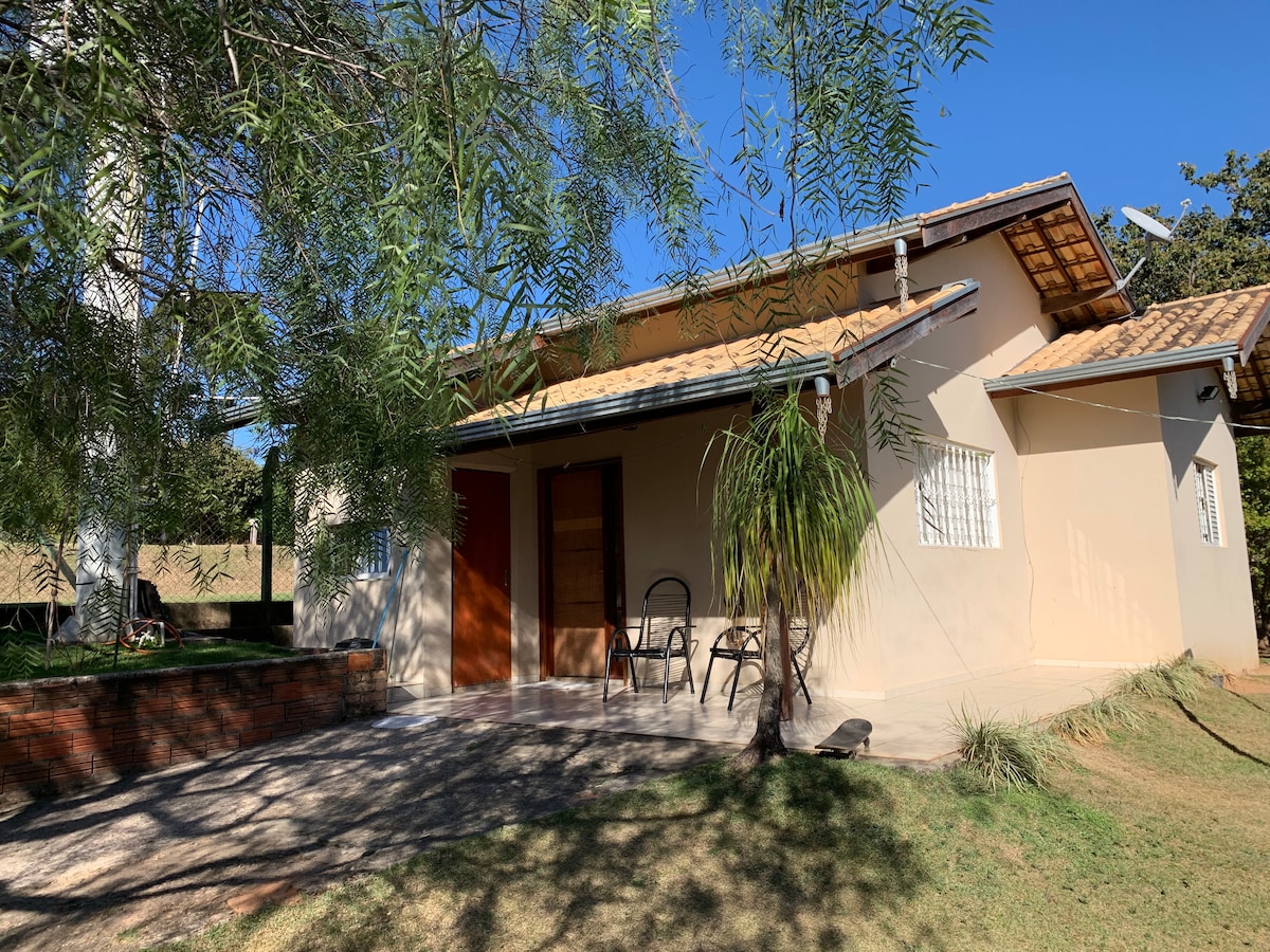 Chácara num lugar tranquilo e agradável ! Casa independente bem montada! Dois quartos com cama de casal. A casa e completa com roupas de cama,mesa e banho limpas e cheirosas! A cozinha, sala e lavanderia tb são completas! Tem cafeteira dolce gusto e deixo garrafas de água p chegada dos Nos quartos e sala tem ventiladores! No banheiro vc encontrará papel higiênico e sabonete e toalhas limpas p todos os hóspedes! A casa tem dois quartos um banheiro , uma cozinha conjugada com sala e lavanderia!