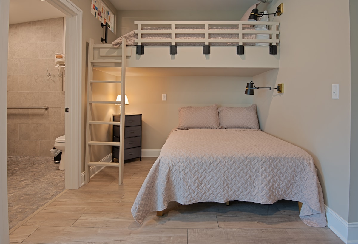 Recently renovated, this cozy 2-story colonial offers a full kitchen with gas range, espresso machine, air fryer, dishwasher, and wine fridge. The kitchen side door opens to a fenced-in backyard. The living room has a sofa, large SmartTV and a dining area with seating for 4. The main level bedroom has a twin trundle bed and vanity. Upstairs is a large loft-style bedroom with king-size bed, faux fireplace, work desk, closet and sturdy oak storage furniture. Washer/dryer available in basement.